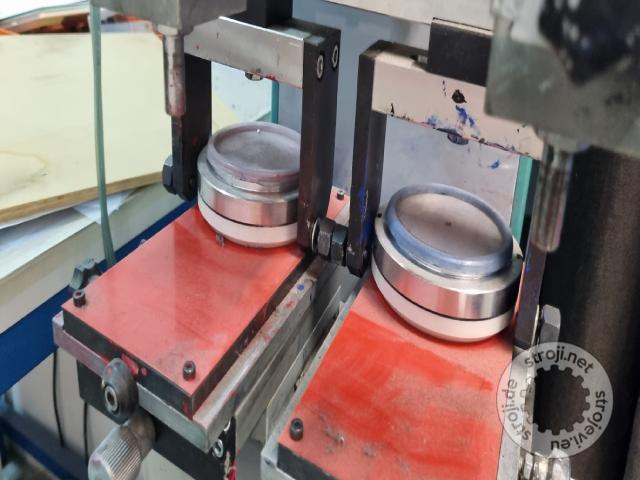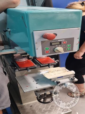 Grafoprint GP 2002. Dvobarvni stroj. Premer notranjosti čašice je 6 cm. Velikost klišeja pa 215x100 mm. Lokacija Maribor.